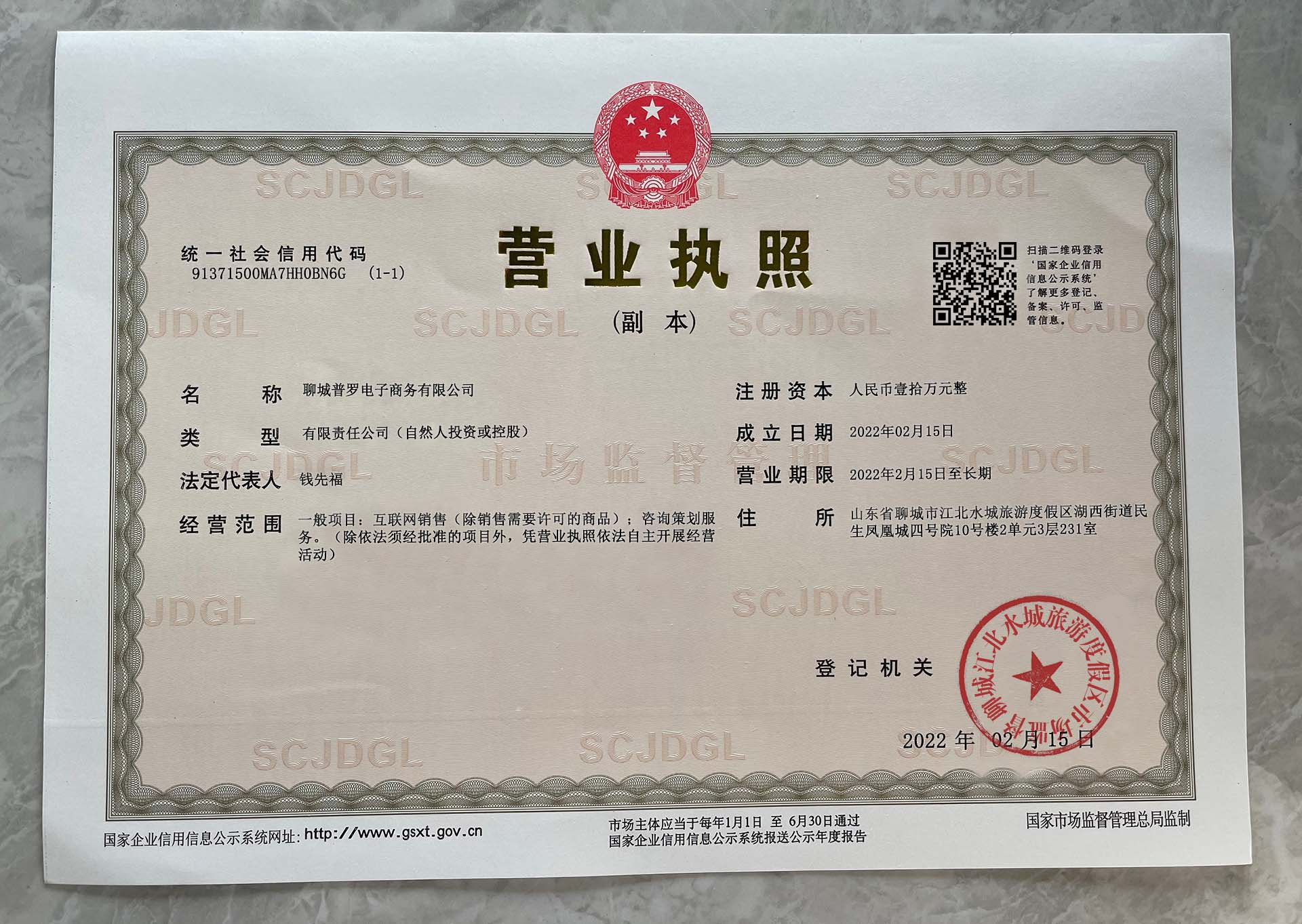 Company address:Room 231, Floor 3, Unit 2, Building 10, No. 4 Courtyard, Minsheng Phoenix City, Huxi Street, Jiangbei Shuicheng Tourist Resort, Liaocheng, Shandong